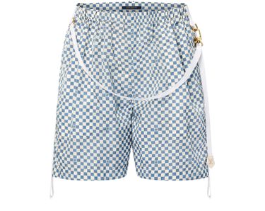 Graphic detailing reworks these sporty shorts with a bold, contemporary look. Cut in a classic straight shape with a comfortable elasticated waistband. The emblematic Damier motif features as an allover signature on lightweight nylon, while the golden hardware and crisp white outer seams and loose clip embellishment add a fresh contrasting accent.