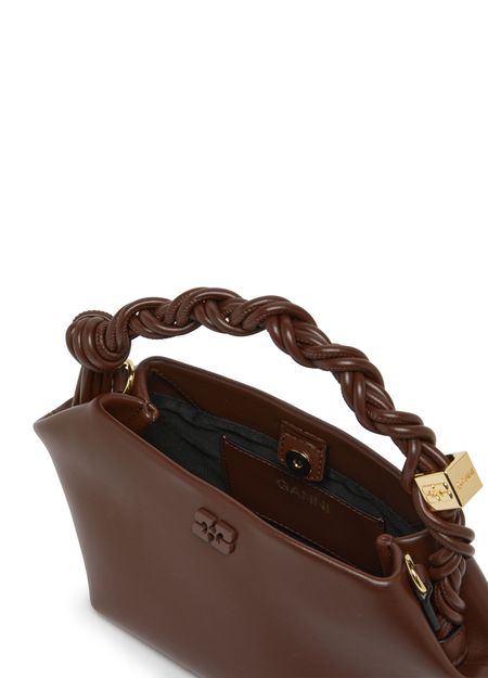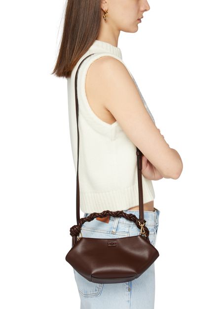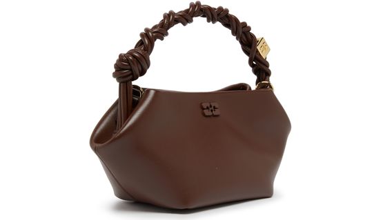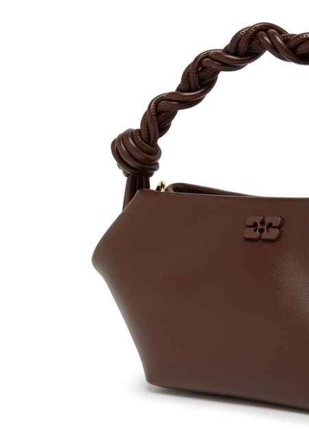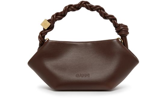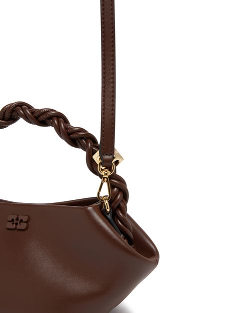 Ganni's Mini Bou bag is a versatile accessory with a snap-button fastening and a detachable strap for hand-carried or shoulder-worn options. Featuring a gold finish and thin strap, this mini bag has a single compartment with a carabiner, printed and embossed logos, and visible topstitching for a chic look.