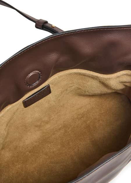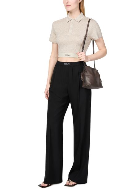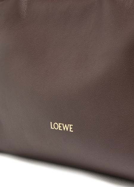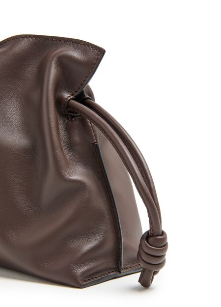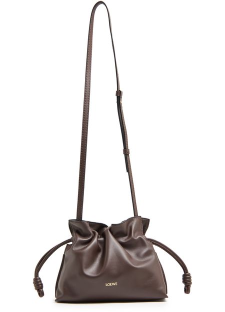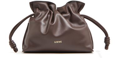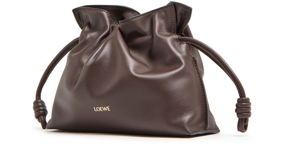 Loewe's Mini Flamenco clutch features a front logo in silver letters and a drawstring closure. It can be hand carried with its thin strap or worn on the shoulder or crossbody with the detachable strap. This versatile bag is perfect for adding a touch of elegance to any outfit.