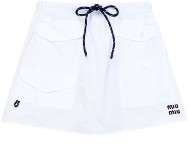 Reveal Miu Miu's mini skirt with two pockets, featuring an embroidered "Miu Miu" logo and a flattering mini length. The elasticated drawstring waist ensures a comfortable fit, while flap pockets and patch details add a modern edge. Perfect for elevating your day-to-night wardrobe.