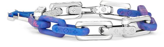 The Maison revisits the Monogram Chain bracelet this season, with a new mix of materials that includes stainless steel, colored plexiglass and recycled resin. House craftsmanship shines in the meticulous Monogram engraving that adorns each metal link. An LV Initials charm adds a colorful signature touch to this masculine piece.