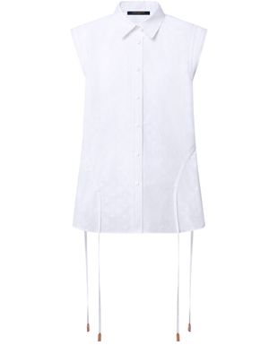 Richly textured and subtly signed, this sleeveless blouse from the Summer Stardust capsule defines a contemporary feminine silhouette. Lightweight fil coupé cotton poplin reveals the iconic Monogram motif in relief, while frills and gathering play with the volume. Complete with a neat collar and mini white buttons for a crisp, tailored finish.