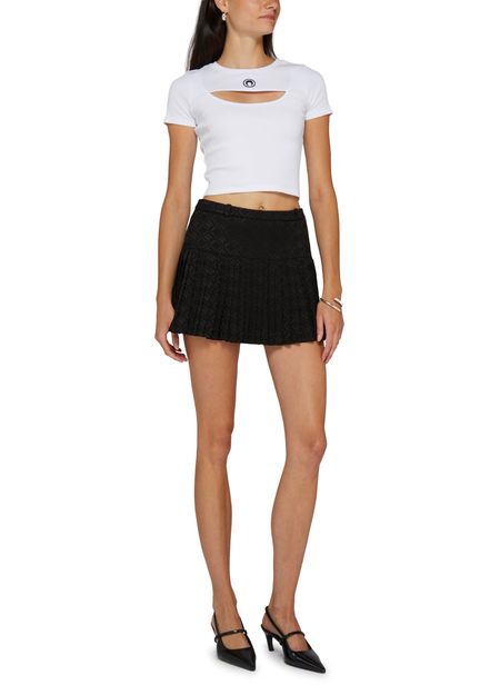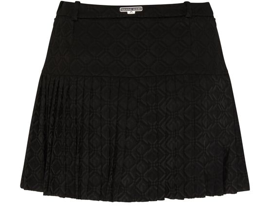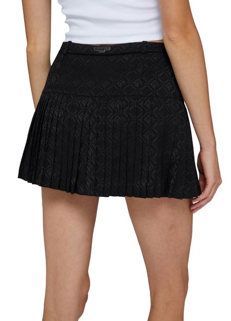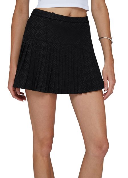 Marine Serre's Moon Diamond jacquard tailoring pleated skirt showcases a mini A-line silhouette, enhanced by pleated details and a belted waist for a flattering fit. With a zipper closure and belt loops, it offers practicality, while the appliquéd logo and visible stitching add a touch of sophistication, featuring a logo at the back.