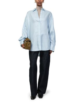 Reveal Toteme's oversized striped shirt, a modern top defined by its relaxed dropped sleeves and long silhouette. The crisp striped print and button fastening create a refined look, while the versatile design transitions seamlessly from workwear to weekend style.