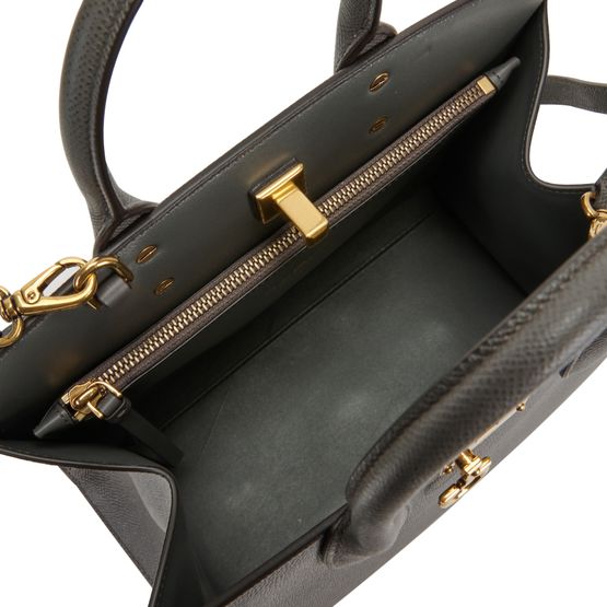 Description : Textured calfskin leather bag Engraved logo, metallic logo on the front, leather handles, leather lining, gold closure.