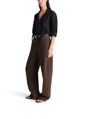 Reveal Lemaire's pants with braided belt, crafted in an ankle-length silhouette with a belted waist and concealed closure. Side pockets and visible stitching add refined detail, while belt loops enhance versatility. These casual pants offer effortless sophistication and comfort for modern wardrobes.