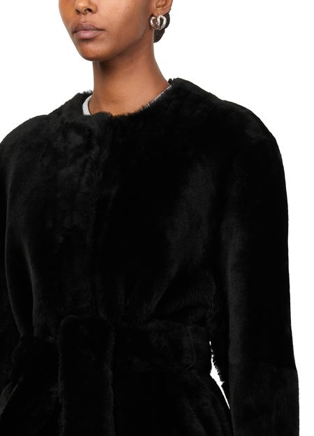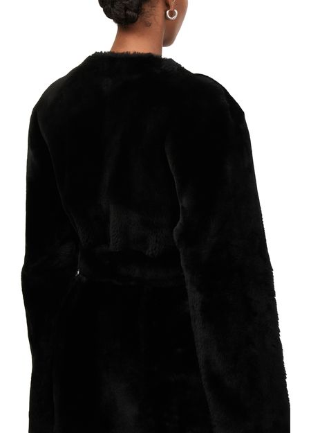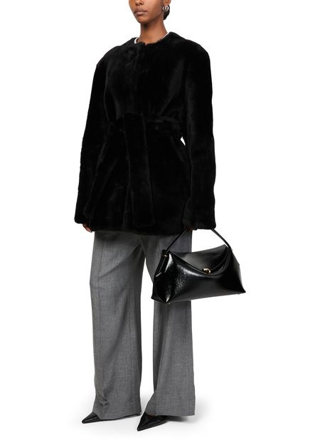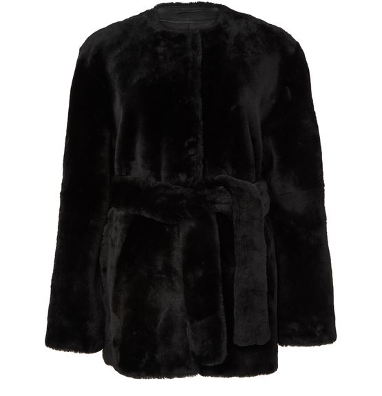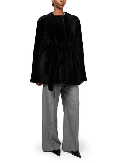 Reveal Toteme's plush shearling jacket, a regular fit piece that exudes warmth with its short length and concealed closure. Crafted from a warm fabric, this collarless, long-sleeved jacket features fur details, offering a versatile style for both casual and formal occasions.