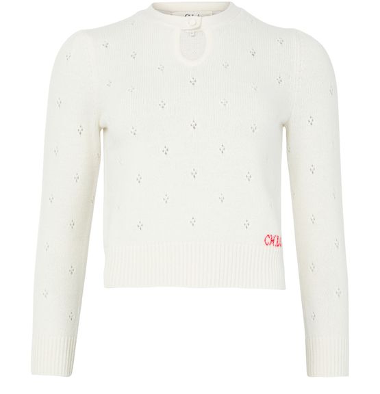 Reveal Chloe's round neck sweater, a masterpiece of knitwear. This crop-length piece features a front buttoned closure and ribbed texture, complemented by embroidered details and logo. The long, cuffed sleeves add a touch of elegance, making it perfect for versatile styling across various occasions.