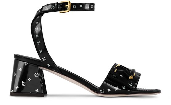 This seasonal edition of the Shake sandal comes in glossy patent calf leather with a nautical-style Monogram print that coordinates with the ready-to-wear collection. Key features of this striking, modern design are its wrap-over front strap with a chunky LV accessory and its low block heel with a graphic V shape.