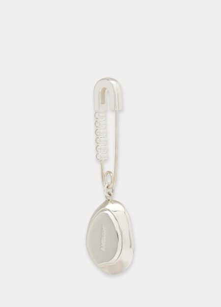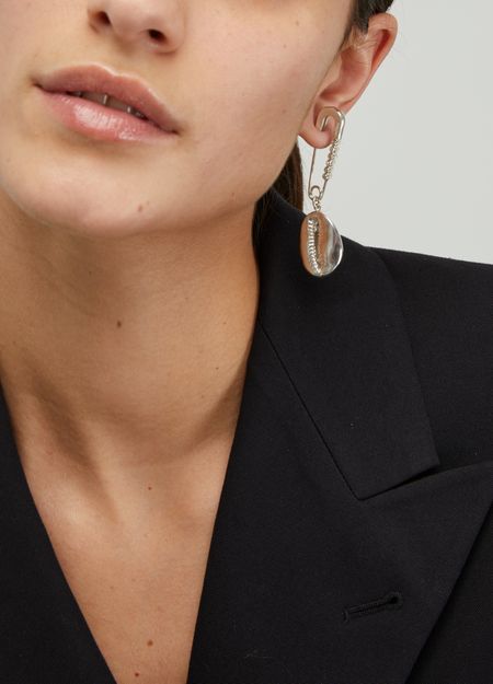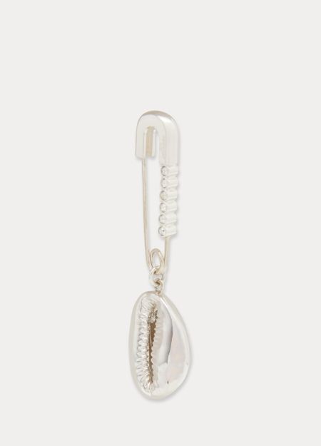 Known for its pop and quirky jewelry, Ambush has added to its designs with the Shell pin earring. This earring incorporates the brand's iconic safety pin base, on which hangs a 925 silver and Swarovski crystal shell. Wear it as a single earring or as a pair, teamed with an oversized cotton outfit from this collection inspired by the sea and travel.