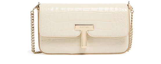 Tom Ford Distribution's Shiny Stamped Croc Mini Bag captivates with its magnetic flap closure and single compartment. Adorned with a front logo and engraved detailing, it boasts visible topstitching and a gold finish. The single handle and detachable chain strap allow for versatile styling, whether worn crossbody or on the shoulder.