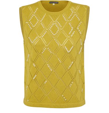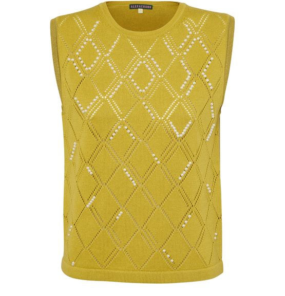 Created in wool and cotton, Alexa Chung's short-sleeved top features a diamond pattern highlighted here and there by pearls.