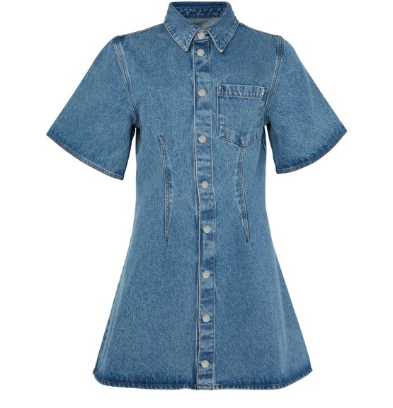 Ami's short-sleeved shirt dress combines effortless style with practicality. Featuring a front buttoned closure and contrast stitching, it boasts a classic shirt collar and a breast pocket. Two patch pockets add functionality to this mini dress, making it the perfect choice for casual outings or relaxed gatherings.