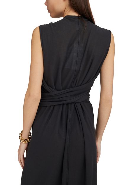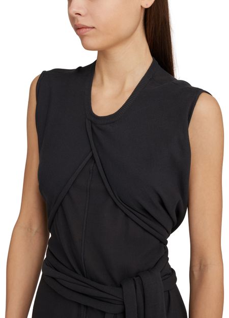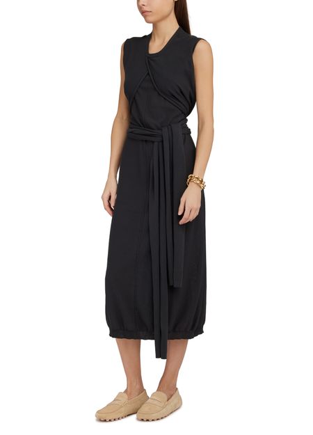 Lemaire's sleeveless dress embodies effortless elegance with its maxi silhouette and round neck. Featuring a belted waist that accentuates the figure, the asymmetric cut adds a modern twist. Perfect for any occasion, this dress effortlessly transitions from casual outings to sophisticated events, making it a versatile staple in your wardrobe.