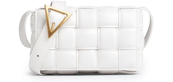 Bottega Veneta's Small Padded Cassette bag is crafted from smooth leather and features the brand's signature Intrecciato weaving. It is designed with a shoulder strap adorned with a triangular buckle and a flap closure. This versatile bag can be worn on the shoulder or crossbody, making it a sleek and functional accessory.