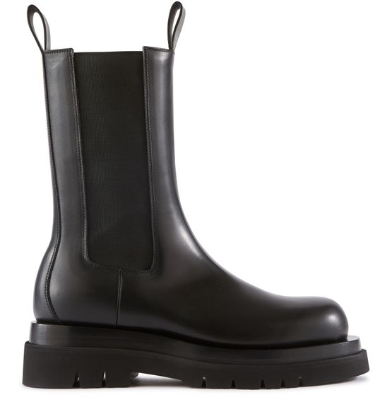 Bottega Veneta's Lug Boots are Chelsea ankle boots made from vegetable-tanned calfskin leather. They feature elasticated sides and a high-top upper for a secure fit. The leather loop at the back allows for easy slipping on and off. The boots are finished with a thick, notched sole for added traction and durability.