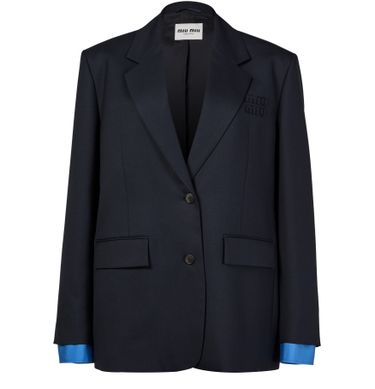 Miu Miu's Straight Jacket showcases a long-sleeved silhouette with a striking notched collar and two-button closure. Flap pockets enhance its practicality, while the removable shirt trim adds versatility. This piece effortlessly balances edgy style with refined elegance, making it a standout choice for those who dare to be different.