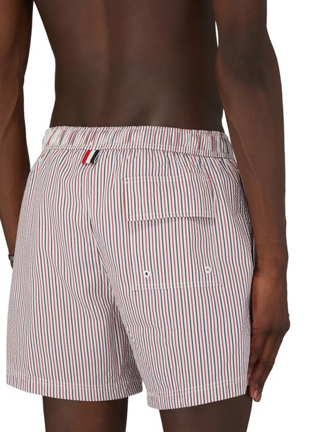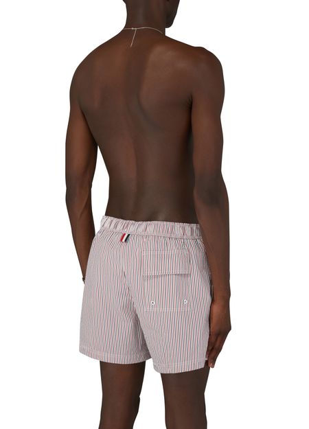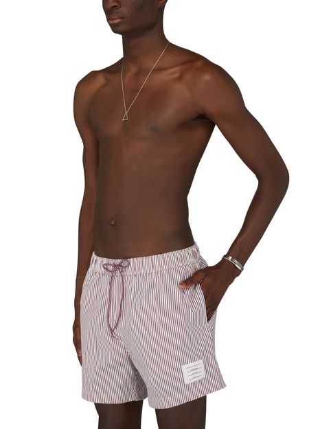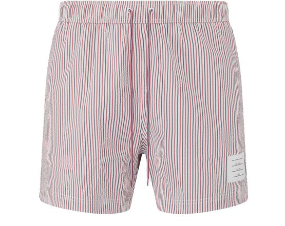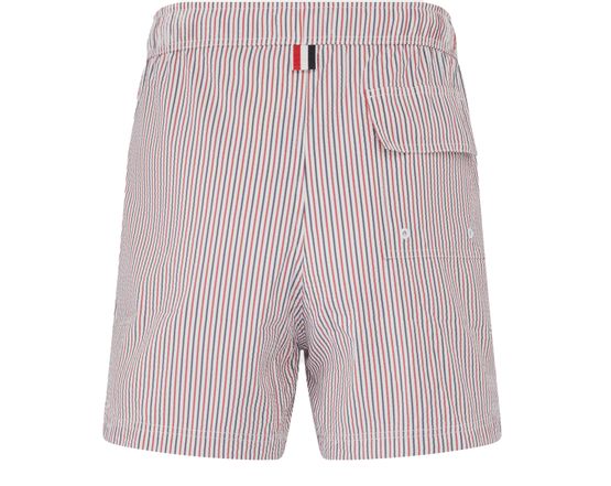 Thom Browne's Swim Shorts offer a stylish take on summer essentials. These cropped shorts feature a slim fit and an elasticated drawstring waist for comfort and ease. The iconic striped pattern adds a touch of sophistication, while the label with logo showcases the brand’s commitment to quality and design. Perfect for beach days.