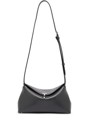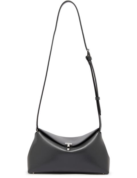Toteme's T-Lock leather clutch is a chic mini bag with a twist lock closure and flap design. Its single compartment features interior patch pockets, while the visible topstitching adds elegance. The metallic logo on the front shines subtly, and the adjustable thin strap allows for effortless crossbody wear, ensuring style and convenience.
