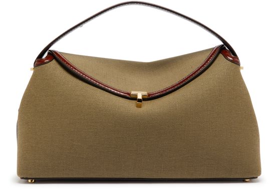 Toteme's T-Lock top handle bag is a chic mini bag designed for versatility. Featuring a flap closure with a logo in silver letters, it boasts contrast stitching and a sleek silver finish. The single compartment includes interior slots for cards and patch pockets, complemented by an adjustable thin strap for hand carrying or crossbody wear.