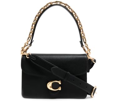 Description : flap closure, gold finish, double handles, metallic logo on the front, visible topstitching, adjustable strap, detachable strap, hand carried, worn on the shoulder, wide strap.