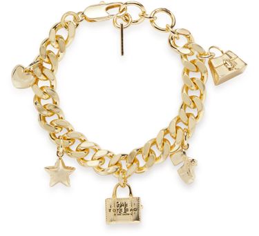 Marc Jacobs's mini Icon Charm bracelet showcases a chic chain bracelet adorned with a front logo in silver letters. Its elegant silver finish highlights the engraved logo, making it a statement piece. The secure clip closure ensures it stays in place, perfect for elevating any outfit with effortless style.