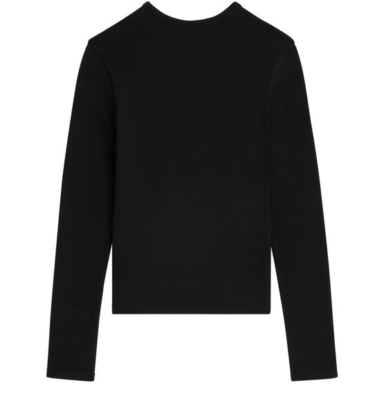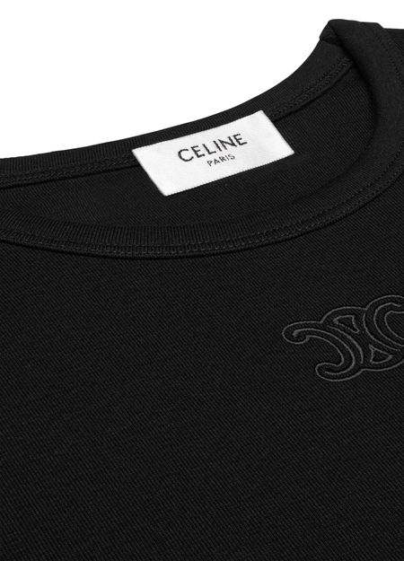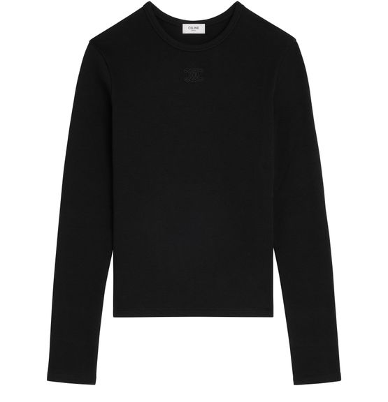 Reveal Celine's Triomphe t-shirt in ribbed cotton jersey, featuring a round neck and long sleeves for a refined silhouette. The ribbed texture and embroidered chest logo add a modern touch, making this top a versatile choice for elevating both casual and sophisticated looks.