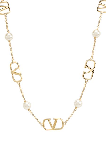 The House of Valentino brings a touch of glamour to this jewel for women. Pearls, as well as the brand logo, can be found at regular intervals along the entire length of this Valentino Garavani logo necklace.