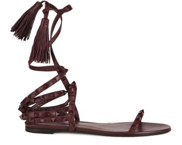 These flat sandals by Valentino Garavani have a folk look. Studded suede straps wrap around the ankle and two pompoms tie at the heel.