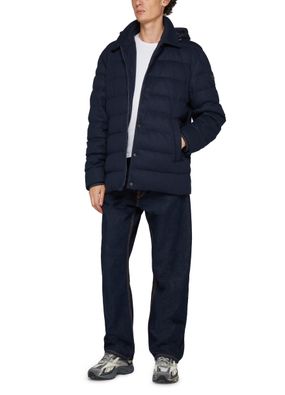 • Description : concealed zipper and snap fastening, short, hood, side welt pockets, long-sleeved, puffer jacket.