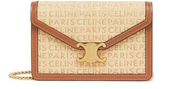 Celine's Wallet on chain Margo captivates with its raffia effect textile and calfskin details. Adorned with an all-over logo and a printed logo, it features contrast stitching that enhances its charm. The flap closure and magnetic closure ensure security, while interior slots for cards offer practicality in a stylish design.