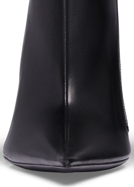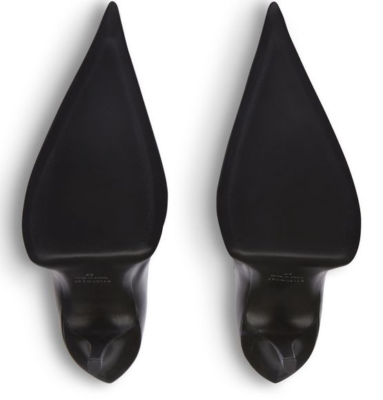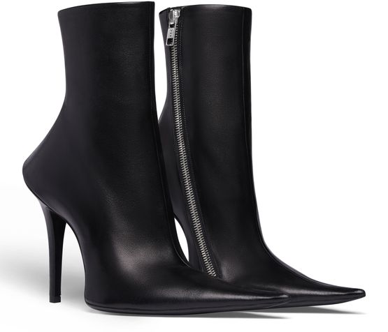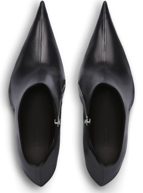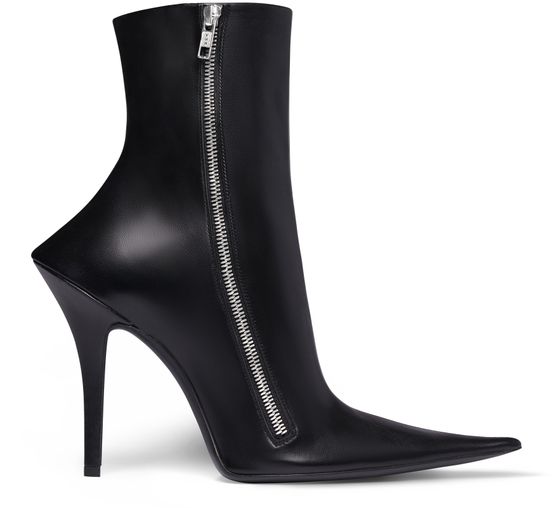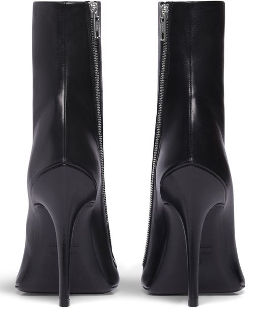 Shiny soft sheepskin bootie with elongated pointed toe, prominent and exaggerated counter, 110mm witch heel, inner zipped closure, tone-on-tone covered heel, black sole.