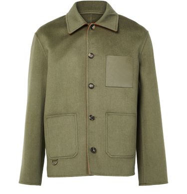 Introducing Loewe's workwear jacket in wool and cashmere, a perfect blend of style and comfort. This short, long-sleeved jacket features a button fastening and patch pockets, offering practicality with elegance. The warm fabric and engraved logo add a touch of sophistication, making it ideal for versatile styling.