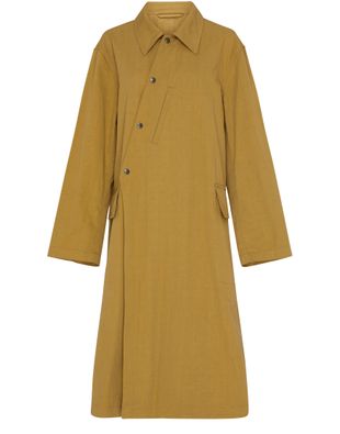 Lemaire's Asymmetrical raincoat showcases a long, elegant silhouette with long sleeves and a front buttoned closure. Its unique design features flap pockets and two front pockets, blending functionality with style. Perfect for unpredictable weather, this coat offers both protection and sophistication for the modern individual navigating the city.