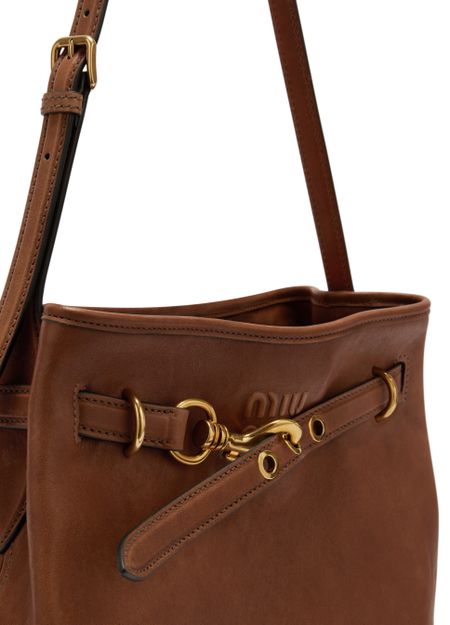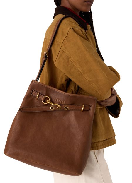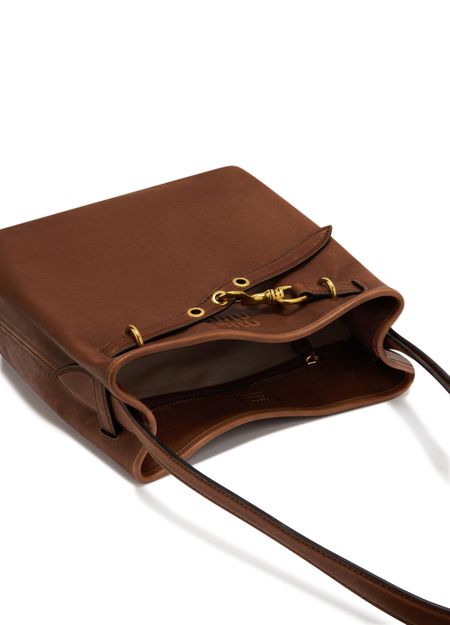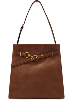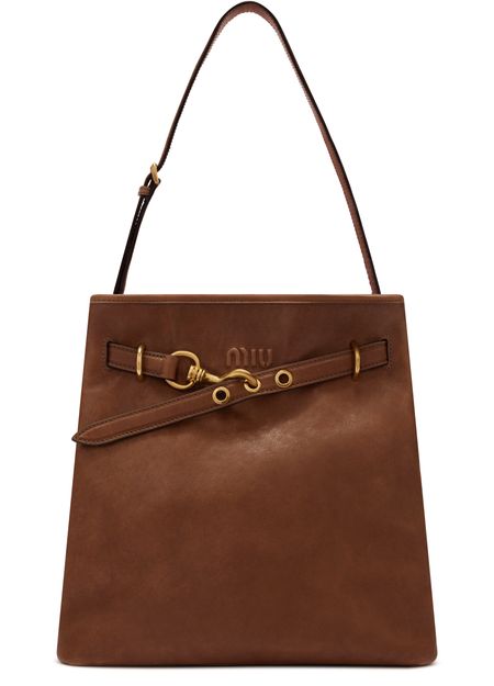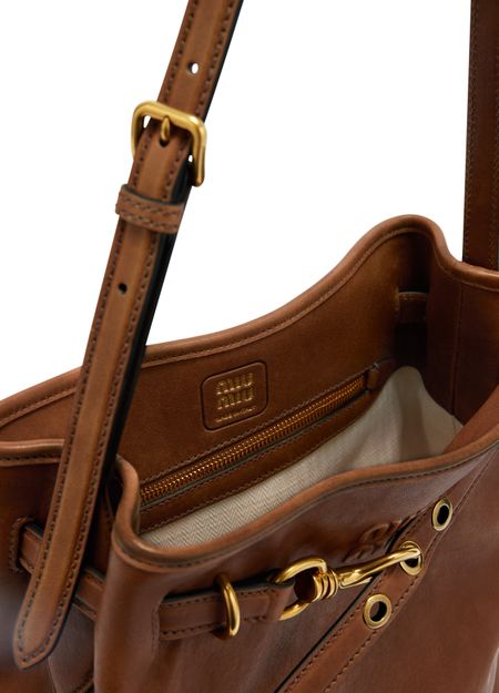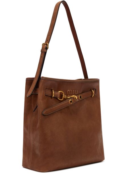 Reveal Miu Miu's aventure tote bag, a statement of refined design. The metallic 'Miu Miu' lettering and metal finish add a modern edge, while the single handle ensures effortless carrying. Inside, a spacious compartment and zippered pocket offer practical organization, complemented by the signature front logo.