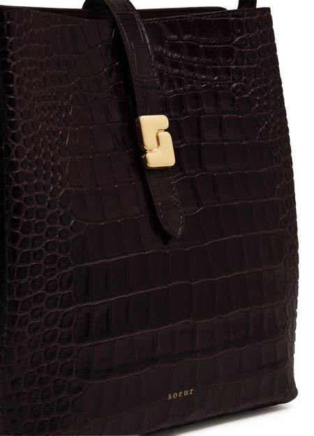 Reveal Soeur's Bello shoulder bag, a modern tote with a striking crocodile print and refined single handle. The gold-lettered front logo and visible stitching highlight expert craftsmanship, while the spacious interior and snap-button fastening offer both style and practicality for everyday sophistication.