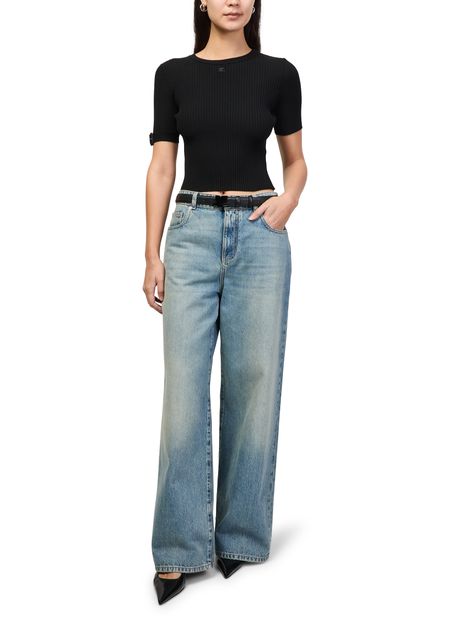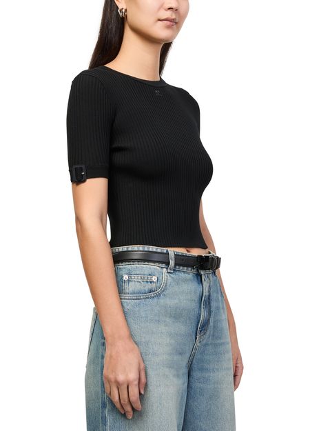 Reveal Courreges's buckle rib knit top, crafted in a ribbed texture with a crew neck and short sleeves for a refined silhouette. The sleek buckle detail adds a modern edge, making this top a versatile choice for pairing with tailored pants or casual denim.