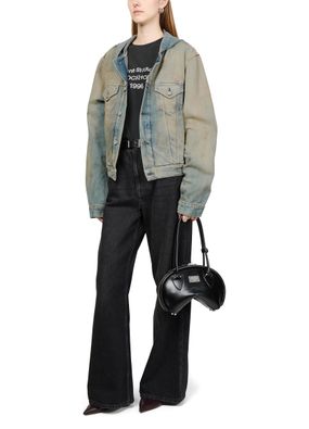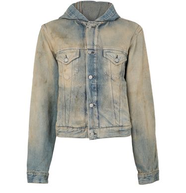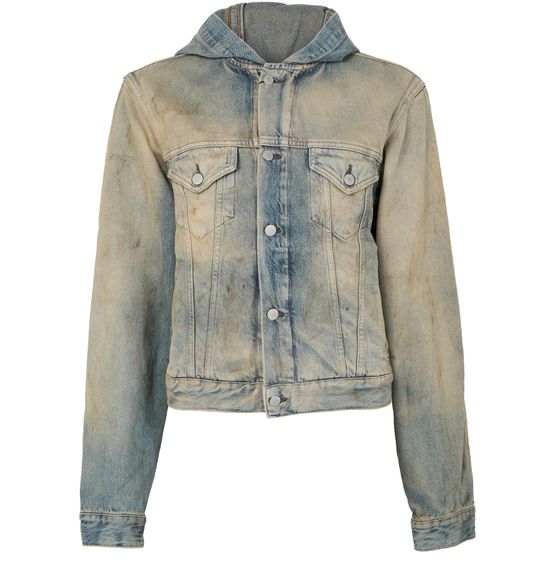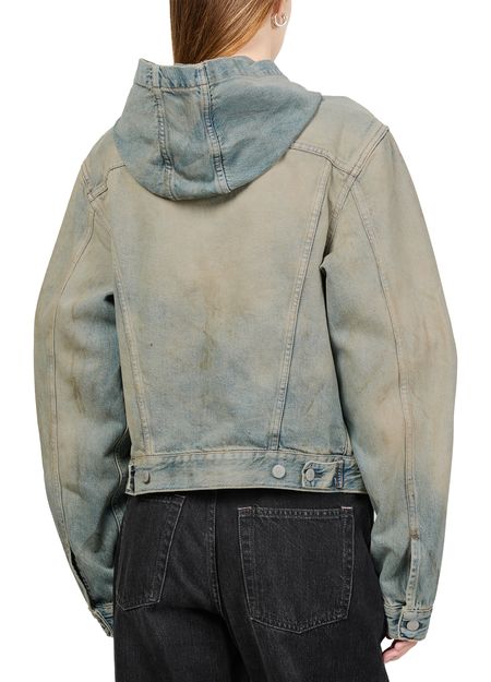 Introducing Acne Studios' denim hood jacket. This regular-fit trucker jacket, crafted from faded denim, boasts a timeless short silhouette. Designed with button fastening and long sleeves, it features two breast patch pockets and a silver finish. Perfect for elevating casual looks, it seamlessly transitions from day to night.