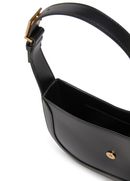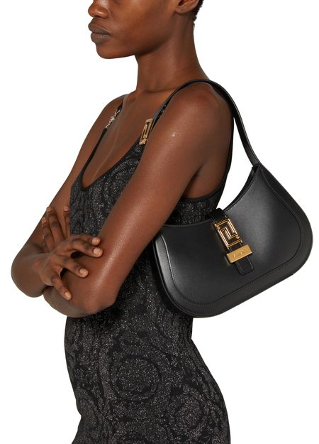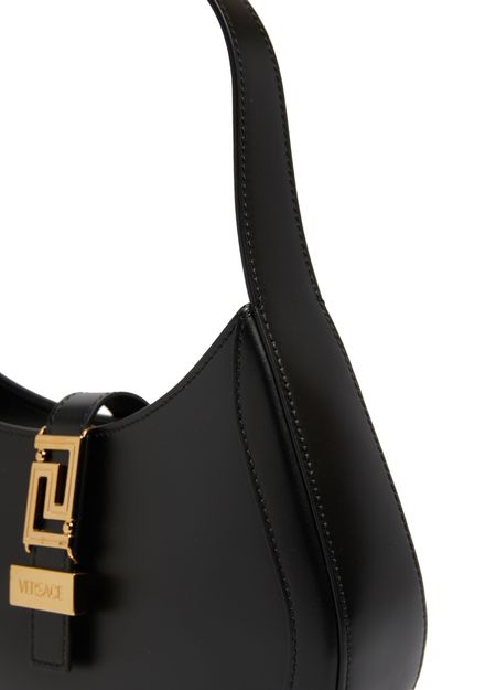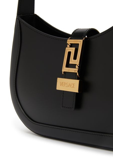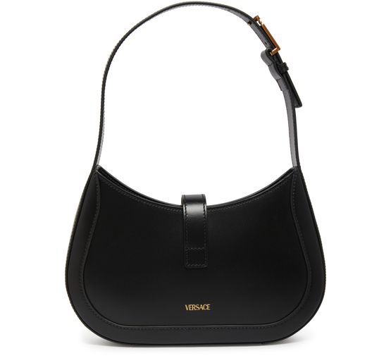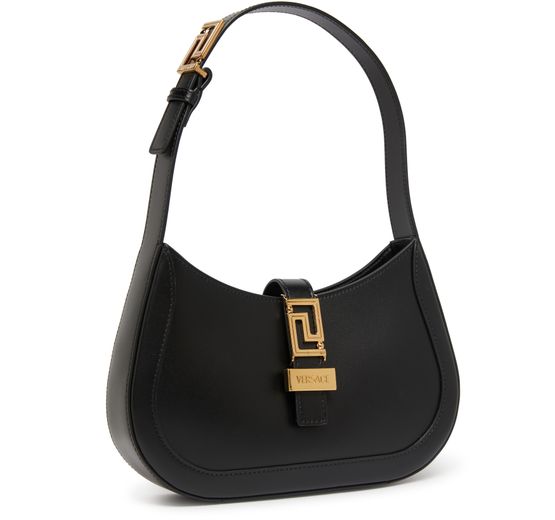 Versace's Greca Goddess small calf leather hobo bag showcases a striking metallic logo on the front, exuding elegance. Its snap-button fastening secures your essentials, while the wide strap offers versatility. Hand carried or worn with the adjustable strap, this bag features a single handle and a luxurious gold finish for a chic touch.