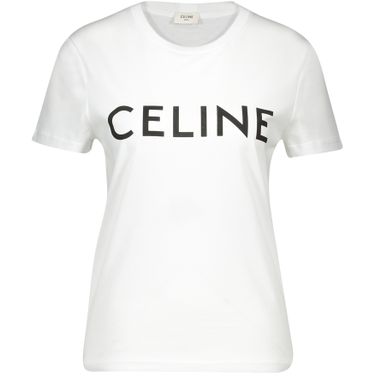 High-end French label Celine adds a touch of elegance to this classic, round-collared jersey t-shirt with its Celine print. Pair with shorts or a mini skirt.