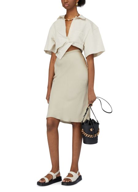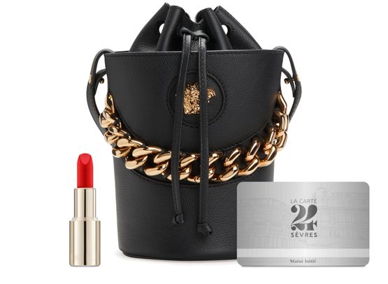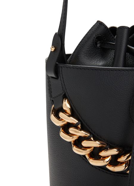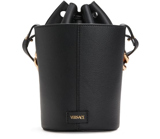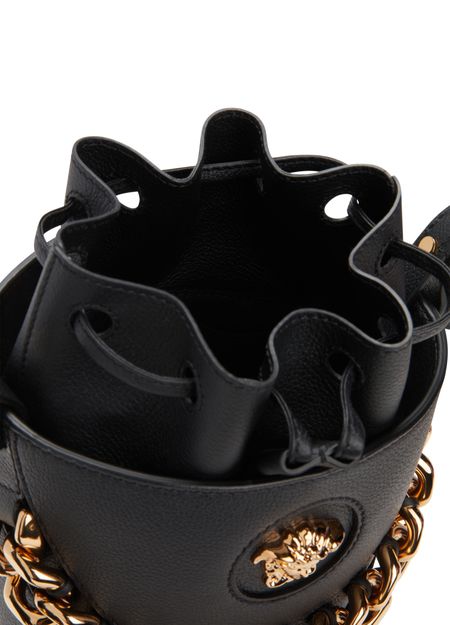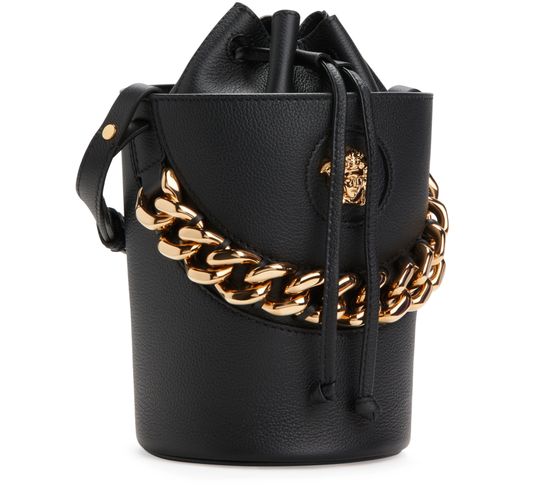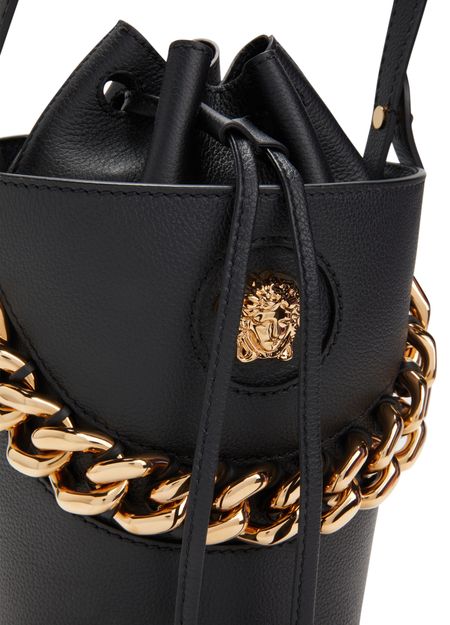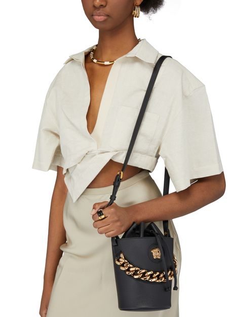 Equipped with a sliding fastening, this Medusa bucket bag features the emblematic golden symbol of the House of Versace on the front. The accessory features a chain handle and a slim shoulder strap for multiple ways of carrying.