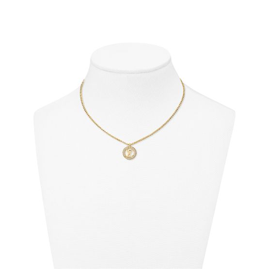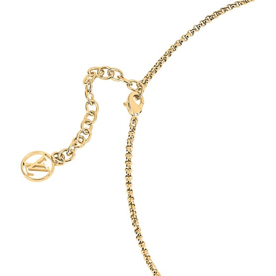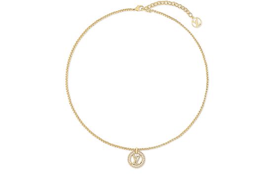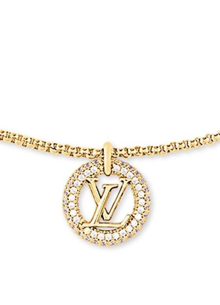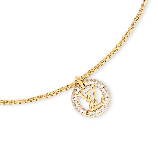 The Louise By Night necklace features a striking LV Circle embellished with a sparkling border. The pendant is suspended from a delicate chain, which can be adjusted for varied wear. A second, smaller LV Circle charm adds a final elevated detail to the end of the necklace.