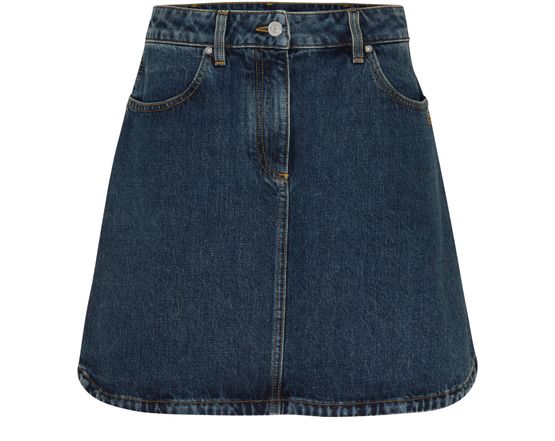 Givenchy's mini skirt in denim showcases a stylish A-line silhouette, featuring a buttoned and concealed zipper closure for a sleek finish. With back darts and belt loops for a tailored fit, this piece is adorned with an appliquéd logo and contrast stitching, complemented by practical front and back patch pockets.