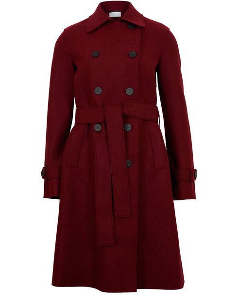 This piece's elegant cut and sophisticated texture demonstrate Harris Wharf's craftsmanship. This pressed wool trench is a women's creation with a delicate shape, adjusted with a belt.