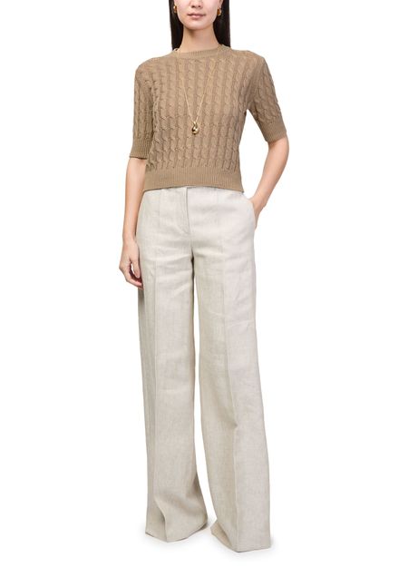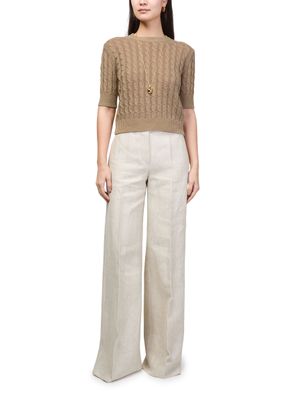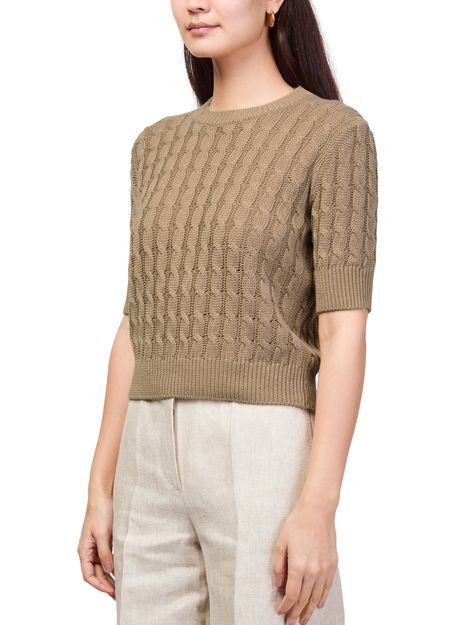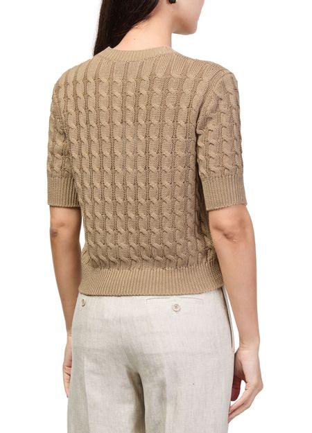 Reveal Max Mara's round neck knitted t-shirt, crafted with a refined crew neckline and short sleeves for a sleek silhouette. The soft knit texture offers comfort and versatility, making this top an effortless choice for layering or standalone wear, seamlessly elevating both casual and polished looks.