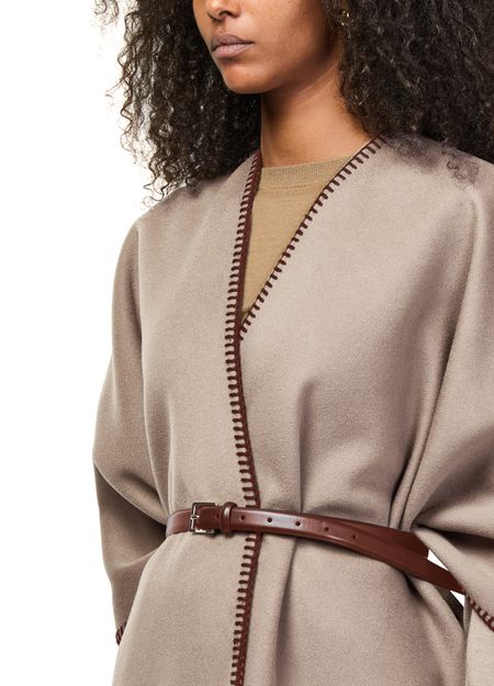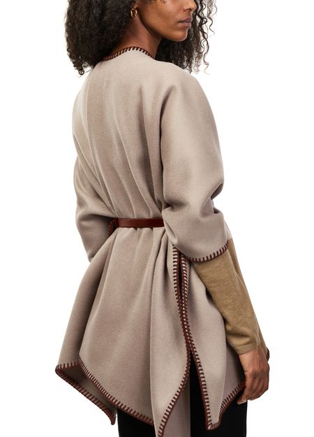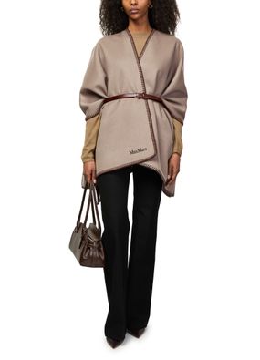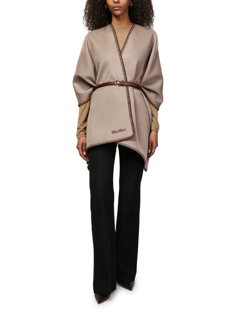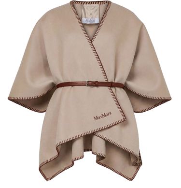 Reveal Max Mara's belted cape, where topstitched edges and a front embroidered logo create a refined statement. This accessory blends modern craftsmanship with subtle branding, making it a versatile addition to any contemporary wardrobe.