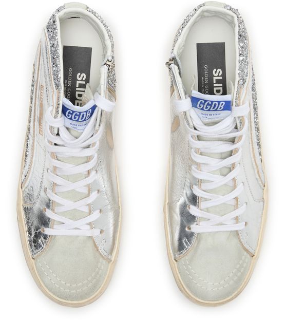Introducing Golden Goose's metallic leather sneakers, a perfect blend of style and comfort. Featuring a high-top upper with visible stitching, these sneakers boast a round, closed toe and a contrasting sole. The zippered closure ensures easy wear, while the iconic logo on the side elevates its appeal.
