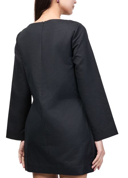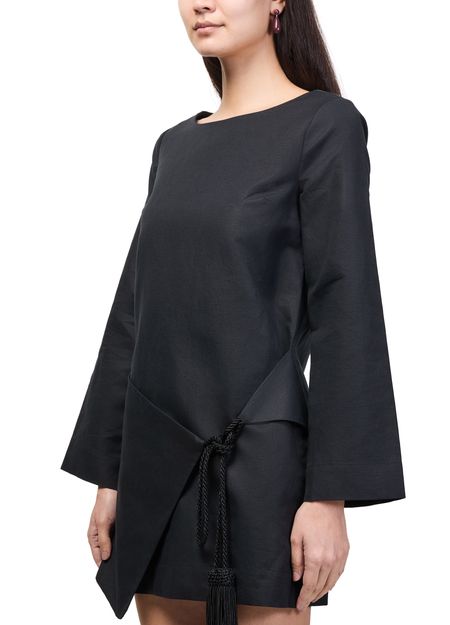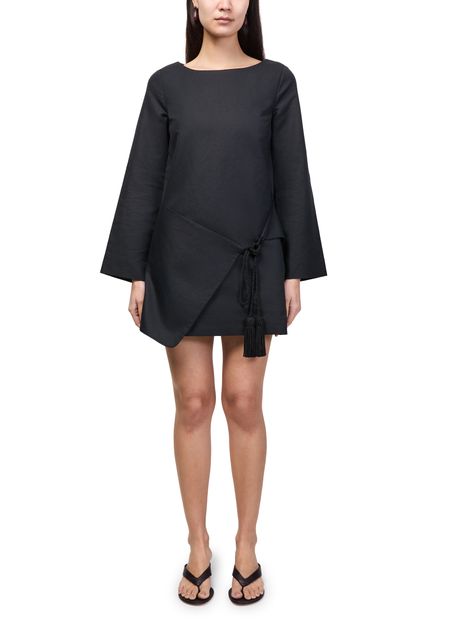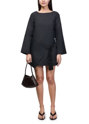 • Description : Mini dress, boatneck, flared sleeve, long-sleeved, tasseled waist, kaftan, asymmetric cut, tassel details.