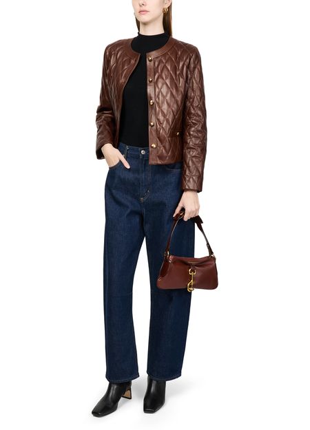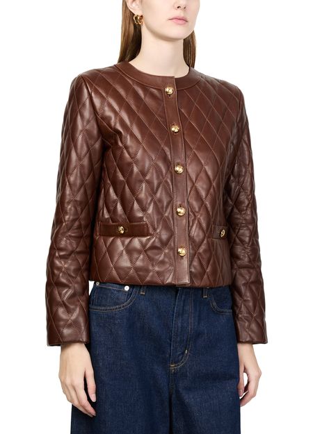 Reveal Nili Lotan's Amy leather jacket, a cropped masterpiece crafted from chevron quilted leather. This collarless design features a button fastening and flap pockets, offering a sleek silhouette. The long sleeves and padded texture add a touch of sophistication, making it perfect for both casual and refined occasions.