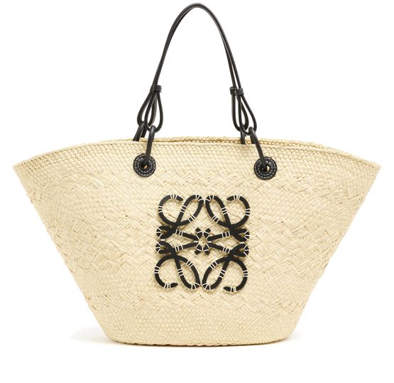 Loewe's Anagram basket is a blend of Iraca palm and calf leather, showcasing artisanal craftsmanship. It features a thin strap, double handles, and can be worn on the shoulder. The front logo adds a touch of sophistication to the simple design. The single compartment offers practicality, while the basket sizing and details may vary.